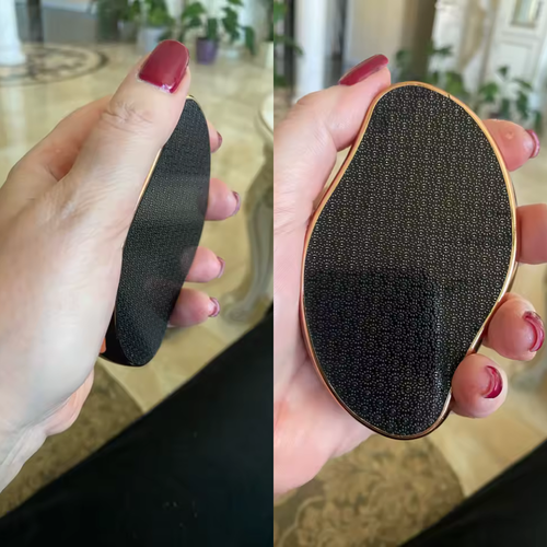 Contrairement aux râpes métalliques, le nano-verre polit très doucement. Tu vas ressentir une vibration très légère, pas de douleur. C'est conçu pour retirer uniquement la peau morte sans agresser la peau saine. Ton talon est lisse et doux, pas attaqué.